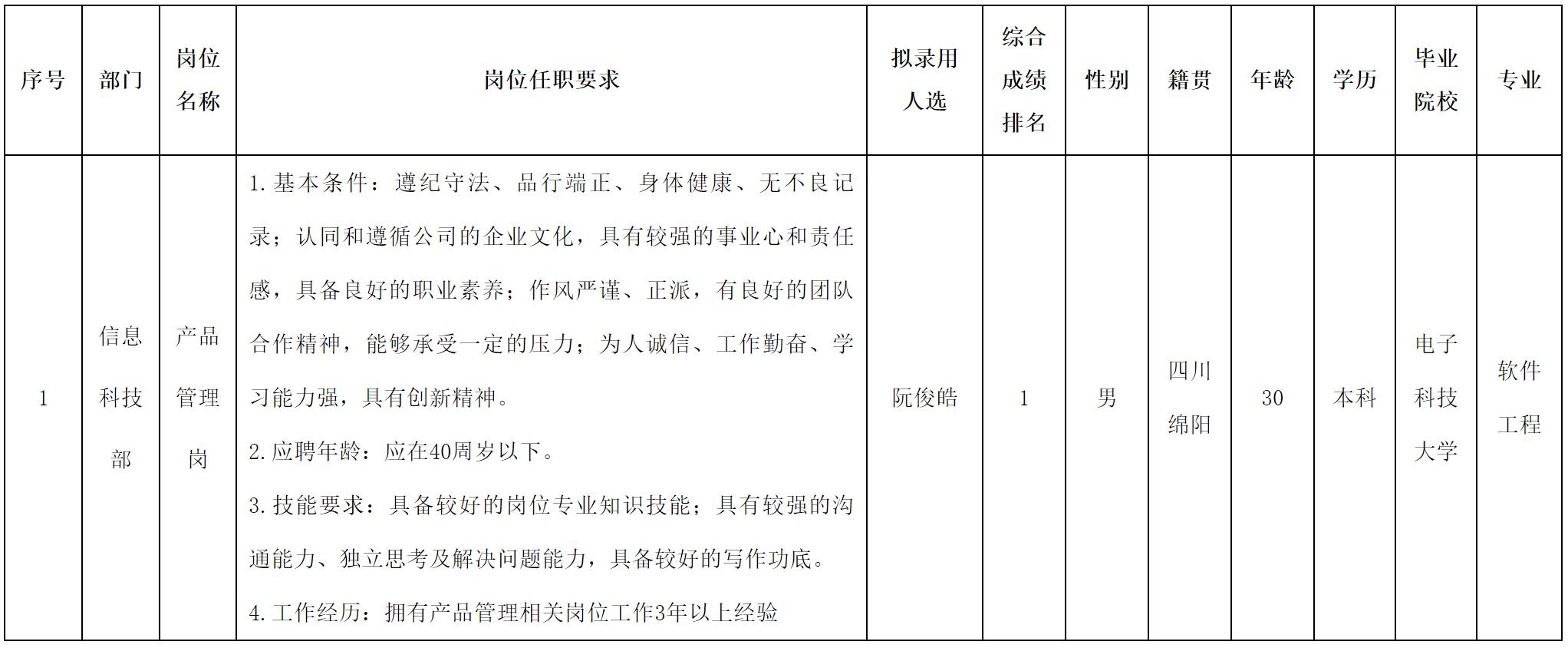 根據(jù)四川長虹集團財務有限公司發(fā)布的招聘公告及招聘相關規(guī)定,經(jīng)面試、考察、體檢等程序,擬錄用阮俊皓同志到長虹財務公司工作,現(xiàn)予以公示,具體情況如下: