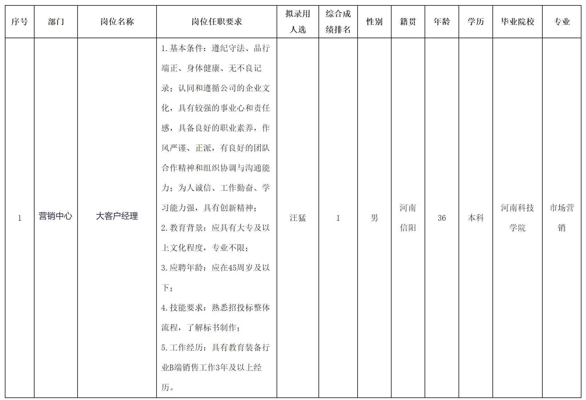 根據(jù)四川長(zhǎng)虹教育科技有限公司發(fā)布的招聘公告及招聘相關(guān)規(guī)定,經(jīng)面試等程序,擬錄用汪猛同志到我公司工作,現(xiàn)予以公示,具體情況如下: