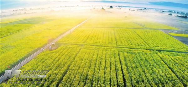 晨光薄霧中,安州區(qū)現(xiàn)代農(nóng)業(yè)糧油園區(qū)的萬畝油菜花海鋪展成一幅流動的油畫。記者 安崢 攝