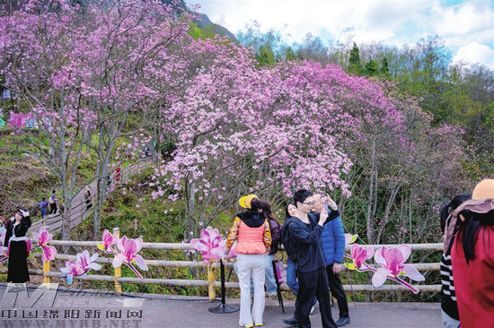 在桂溪鎮(zhèn)九皇山、藥王谷景區(qū),漫山辛夷褪去寒意、蓄力綻放,粉的、白的、紅的、紫的花朵綴滿枝頭,如煙似霞、美不勝收。山間清風(fēng)裹挾著花苞的清甜,游客們伴著羌家姑娘的舞步共跳沙朗,歡聲笑語(yǔ)間,羌山春日的氛圍感拉滿。