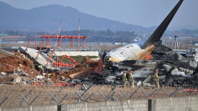 韓國濟(jì)州航空公司一架客機(jī)12月29日在韓國西南部全羅南道務(wù)安國際機(jī)場墜毀,機(jī)上181人中僅兩人幸存。這是韓國國內(nèi)發(fā)生的傷亡最嚴(yán)重的一起空難。 [