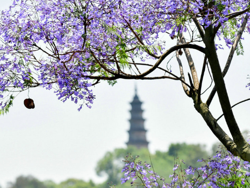 初夏的綿陽,一株株紫色的藍花楹紛紛綻放,在三江創(chuàng)享廣場、涪濱路、三江湖濕地公園等地。 [