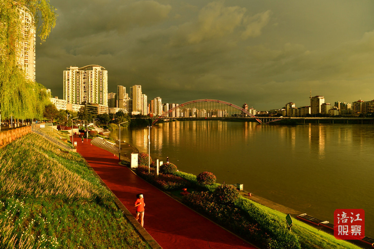 7月22日早上6時許,初升的太陽從東方冉冉升起,一時間霞光萬丈,把綿陽城區(qū)三江湖兩岸的樓宇、樹木、健身步道染上了一層金黃色,與短暫出現(xiàn)的彩虹相映成景,美不勝收。[