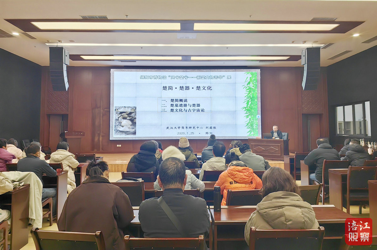 1月25日,武漢大學簡帛研究中心教授、博士生導師劉國勝,應(yīng)邀在綿陽市博物館學術(shù)報告廳作《楚簡·楚器·楚文化》專題講座,帶領(lǐng)觀眾走近絢爛多彩的楚文化世界。[