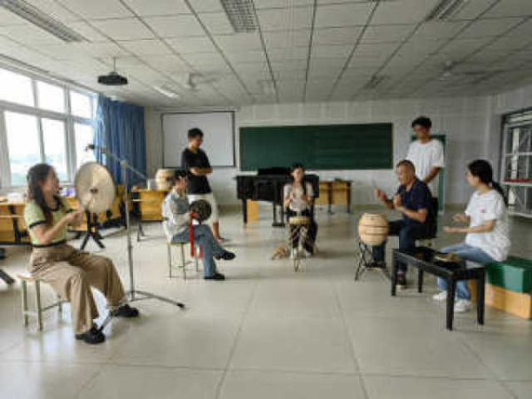 “現(xiàn)在我們開(kāi)始新學(xué)期的第一課,同學(xué)們先來(lái)復(fù)習(xí)下上學(xué)期學(xué)習(xí)的內(nèi)容?!睅滋烨暗囊粋€(gè)下午,在綿陽(yáng)師范學(xué)院音樂(lè)與表演藝術(shù)學(xué)院音樂(lè)樓五樓一間教室里,綿陽(yáng)市非遺中心鼓師趙強(qiáng)以傳統(tǒng)音樂(lè)傳承班教師的身份,開(kāi)始了新學(xué)期的第一次授課。 [