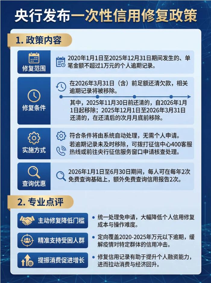 一次性信用修復(fù)政策生效實(shí)施,如何兼顧“包容”與“約束”?哪些人能獲得支持? 新年伊始,有不少人驚喜地發(fā)現(xiàn),自己個(gè)人征信報(bào)告里的貸款逾期記錄減少了,有些甚至直接歸零。據(jù)了解,這一變化源于中國人民銀行近期出臺(tái)的“一次性信用修復(fù)政策”。[