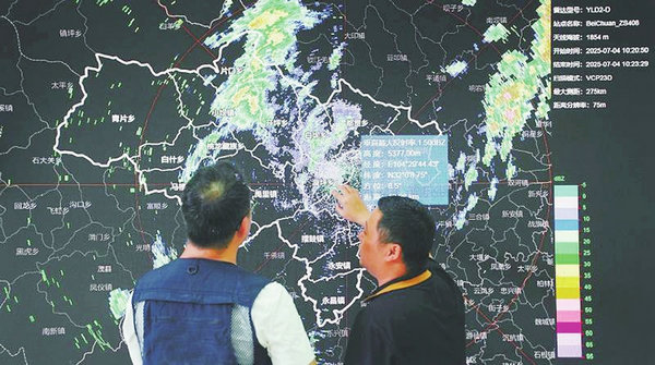 7月4日,在綿陽市北川防汛抗旱指揮部值班室,指揮大屏上實時顯示著全縣范圍內(nèi)降雨量。這些來自相控陣?yán)走_(dá)的數(shù)據(jù),成為防汛決策的重要依據(jù)。[