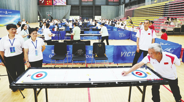 7月7日,在四川文化藝術(shù)學(xué)院梓潼校區(qū)綜合館,綿陽市第八屆運動會老年組桌上冰壺球開賽。[