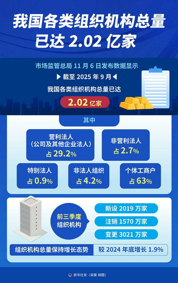 市場監(jiān)管總局6日發(fā)布數(shù)據(jù)顯示,截至2025年9月,我國各類組織機(jī)構(gòu)總量已達(dá)2.02億家。其中,營利法人(公司及其他企業(yè)法人)占29.2%;非營利法人占2.7%;特別法人占0.9%;非法人組織占4.2%;個(gè)體工商戶占63%。[详情]