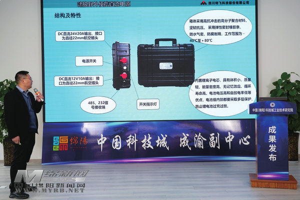 12月9日,中國(綿陽)科技城工業(yè)技術研究院舉行線上發(fā)布會,發(fā)布了由我市企業(yè)——四川特飛科技股份有限公司研發(fā)生產(chǎn)的“便攜式移動電源與氣象探測設備”成果。 [